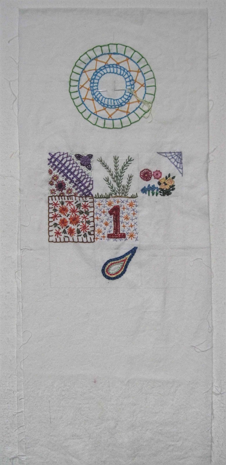 Well, there are a few stitches that have been added since this picture was taken but you get the idea. I finished framing the numeral one, started another square of daisies, fleshed out the garden above with more flowers and foliage, and embellished the paisley with some pistil stitches.