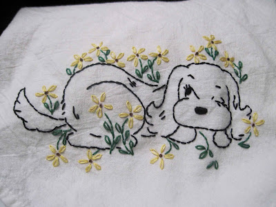 After the completion of these two small cases (they're each about 4.5" x 3.5") I was at something of a loss as to what to tackle next. That's when I decided to add more puppies to the dish towel I've been embroidering.