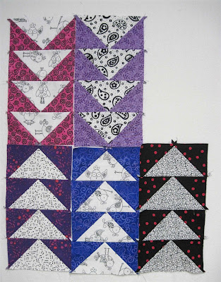 Now about those squirrels: I thought I would use the Hourglass blocks and the families of flying geese I introduced in this post as leaders and enders. The flying geese work well in that capacity as long as I don't get carried away and sew them all up at once. The Hourglasses have turned out to be a little problematic however. I'm using the old fashioned method for making the blocks wherein you cut big squares and quarter them on the diagonals. It's the method I learned first and am most comfortable with. It allows me the freedom I want for mixing prints. However, I've had to take a couple of sub-units apart and resew them because I sewed down the wrong side of the triangles when I lost track of what I was doing. These are the Hourglasses I've made most recently: