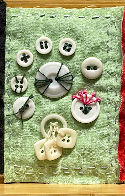 First, I used the technique I just learned for making hexagons out of folded circles to make a few hexies that may or may not go on this scroll. I've done some additional stitching too, only some of which is very visible.