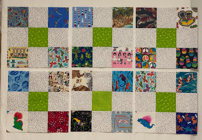 I had some 5.5" squares in the stash and enough of the white scattered with black music notes to go the distance for 13 of the large nine patch blocks. This was a great opportunity to cut up some leftovers and older prints to make what will essentially be an Eye Spy type quilt. The next step will be to quarter these blocks...